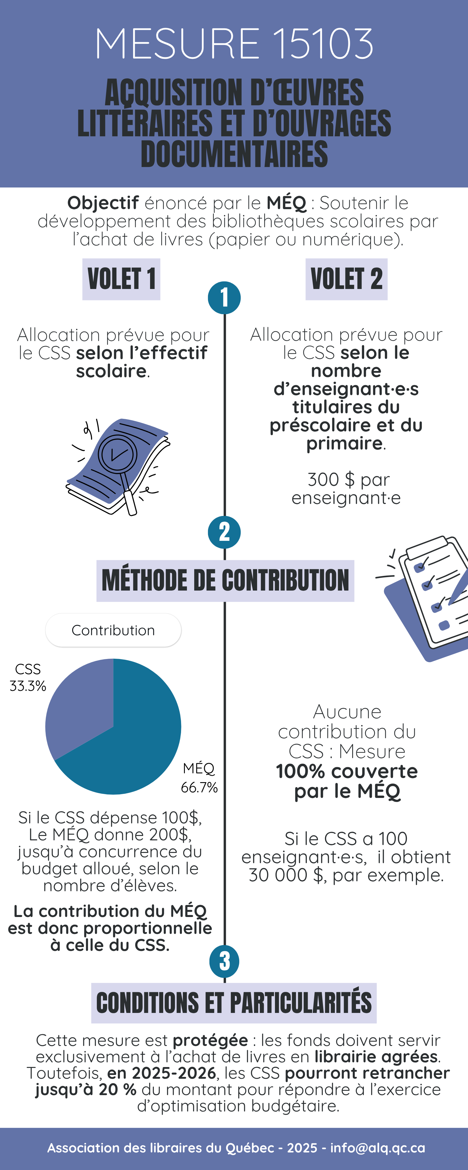 Bien que la mesure soit protégée – c’est-à-dire que les fonds doivent être consacrés exclusivement à l’achat de livres –, pour l’année 2025-2026, les CSS pourront retrancher jusqu’à 20 % des montants pour répondre à l’exercice d’optimisation budgétaire demandé, conformément à la mesure 16034.